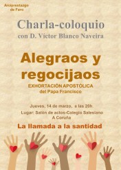 El jueves, día 14 de marzo, a las 20:00h., en el Salón de Actos del Colegio de los Salesianos, tendrá lugar una charla-coloquio organizada por nuestro arciprestazgo de Faro y que impartirá D. Víctor Blanco Naveira, arcipreste de Sobrado y fundador de la Asociación Raíña Paraiso. Esta charla intentará motivarnos a vivir intensamente la Cuaresma animados y ayudados por la Exhortación Apostólica del Papa Francisco “ Alegraos y regocijaos”. Sería bueno que ustedes invitaran a asistir a todas las personas que crean conveniente.