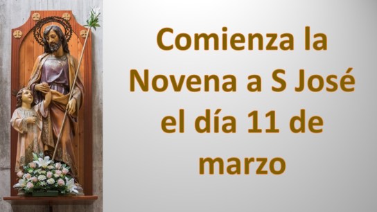 El miércoles, día 11 de marzo, comenzará la novena de nuestro patrono San José. Todos los días, antes de la celebración de la misa diaria, la rezaremos. Presentamos al Señor, bajo la intercesión de San José, nuestras súplicas. Terminará el jueves, día 19 de marzo, solemnidad de San José, con la celebración solemne de la eucaristía a las 12:30h.