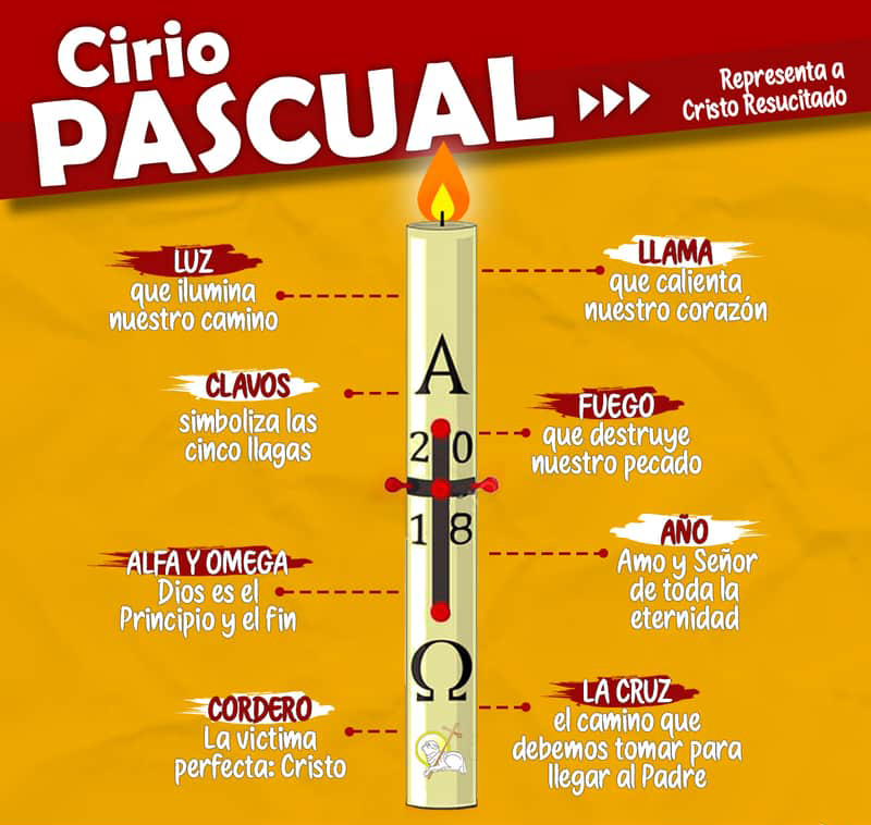Es el cirio que nos hace presente que “la luz de Cristo, que resucita glorioso, disipa las tinieblas del corazón y del espíritu”. La luz de este cirio- como la luz de Cristo- nos introduce, en la noche santa de Pascua, hacia el interior de la iglesia y nos lleva a escuchar abundantemente las Sagradas Escrituras y, sobre todo, a participar, iluminados por la fe, de los sacramentos por los que la iglesia maravillosamente renace y se alimenta.
