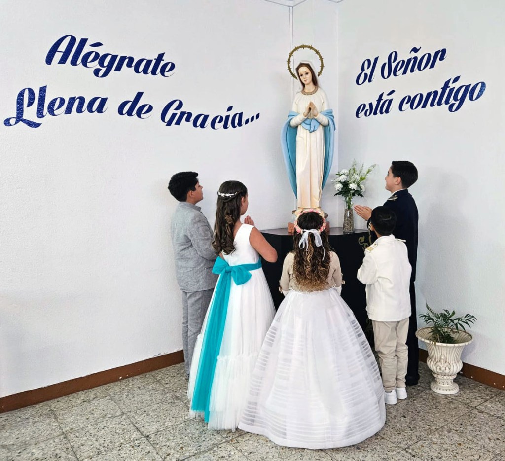 El pasado día 25 de mayo celebramos con gran alegría las Primeras Comuniones en nuestra parroquia, un momento muy especial que marca un hito en la vida espiritual de nuestros niños y niñas. La ceremonia fue un evento lleno de amor y emoción, donde cada pequeño se vistió con su mejor atuendo, simbolizando la pureza de su corazón en este momento tan significativo. Oramos con la esperanza de que este comienzo en la relación de estos niños y niñas con Jesús Eucaristía continúe toda su vida, dándoles fortaleza y guía en su camino de fe, y que siempre recuerden la importancia de este Sacramento en su desarrollo espiritual y personal. La comunidad parroquial se unió en esta celebración, destacando el compromiso de apoyar a cada familia en su viaje de fe y en la formación de una sólida vida cristiana.